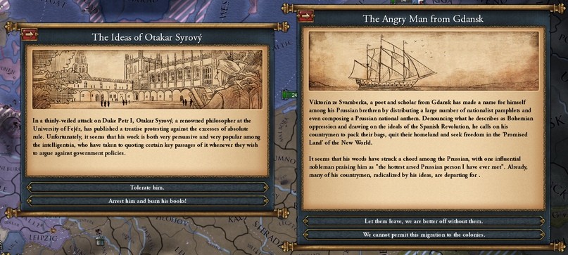 Исторически, Французская революция стала для всех неожиданностью, но в ретроспективе мы можем наблюдать множество событий, сыгравших важную роль для её развития и даже предвещающих будущую катастрофу. Мы перенесли их в игру в виде линейки событий, вдохновлённых дореволюционной Францией, для всех стран, в которых может произойти революция. В зависимости от ваших выборов значительно увеличится вероятность появления в ваших землях центра революции. В наличии имеются следующие события: