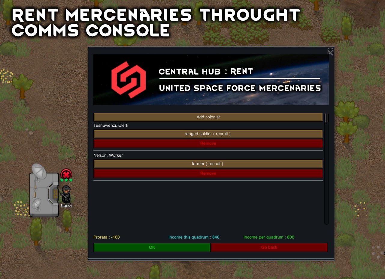 Данный мод дает возможность через консоль связи нанимать наемников через консоль связи и использовать их в качестве телохранителей. Наемники находятся под вашим контролем (как и другие колонисты) на протяжении всего контракта. Контракты наемников не ограничиваются солдатами, вы также можете нанять рабочих (художников, фермеров, ученых, дипломатов, строителей …).