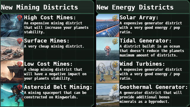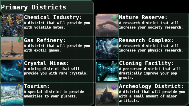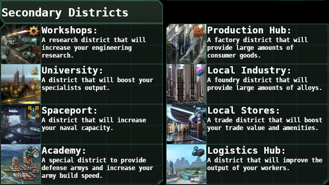 - Вторичные районы, которые можно выбрать после разблокировки соответствующих технологии (вторичные районы не закрыты и ограничены одним типом для планеты);