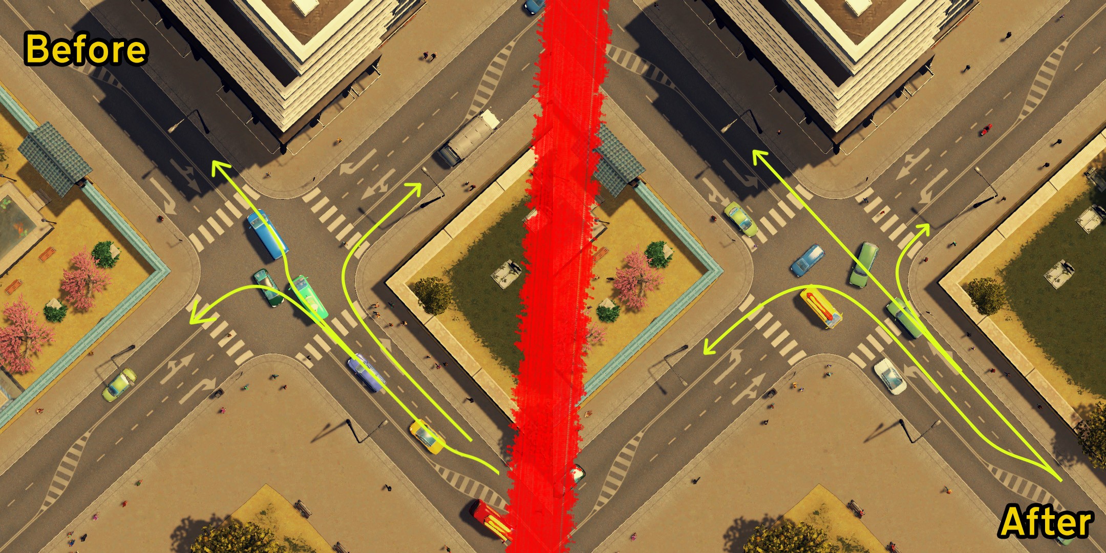 Мод переопределяет правила соединения полос движения по умолчанию для всех дорожных развязок. Он способствует созданию выделенных поворотных полос и более сбалансированному распределению соединений полос движения в каждом направлении, что способствует лучшему использованию полос движения транспортными средствами. Есть две ситуации, в частности, когда он работает лучше, чем поведение игры по умолчанию: